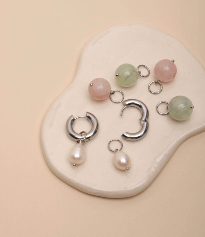 Par de cristales rosas, par de cristales de jade, par de perlas de río.