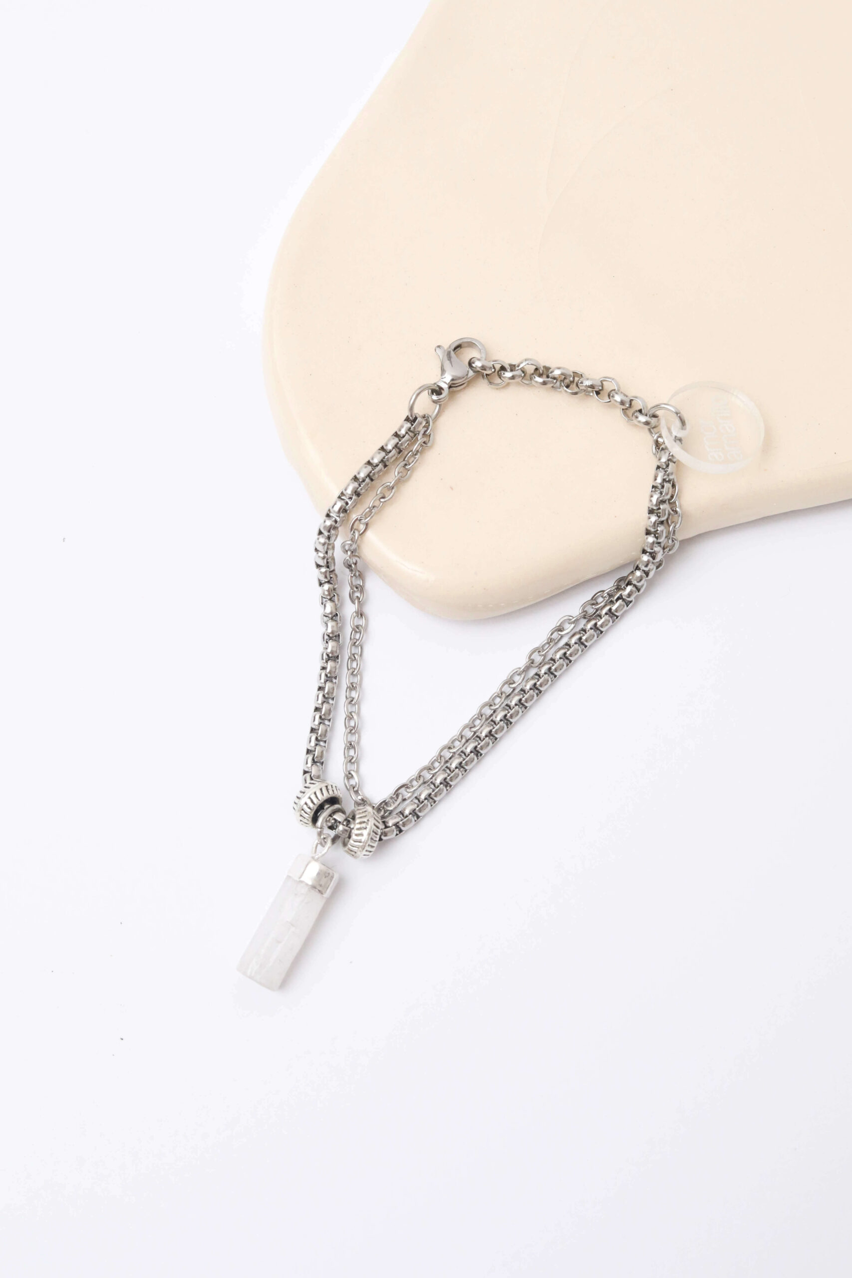 Cadena de alargue, argollas y cierre de acero quirúrgico. Chapita de la marca de acrílico.