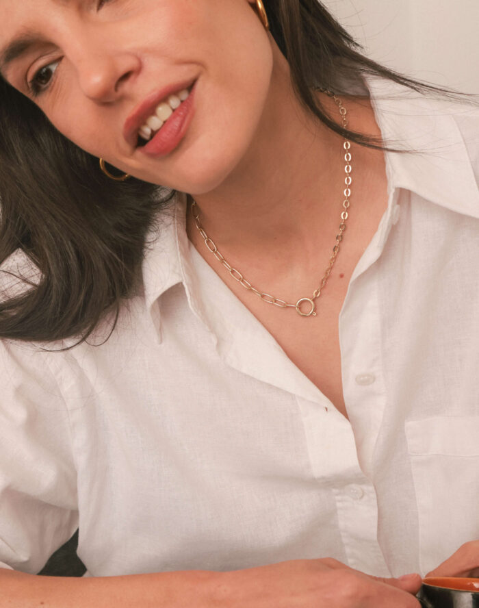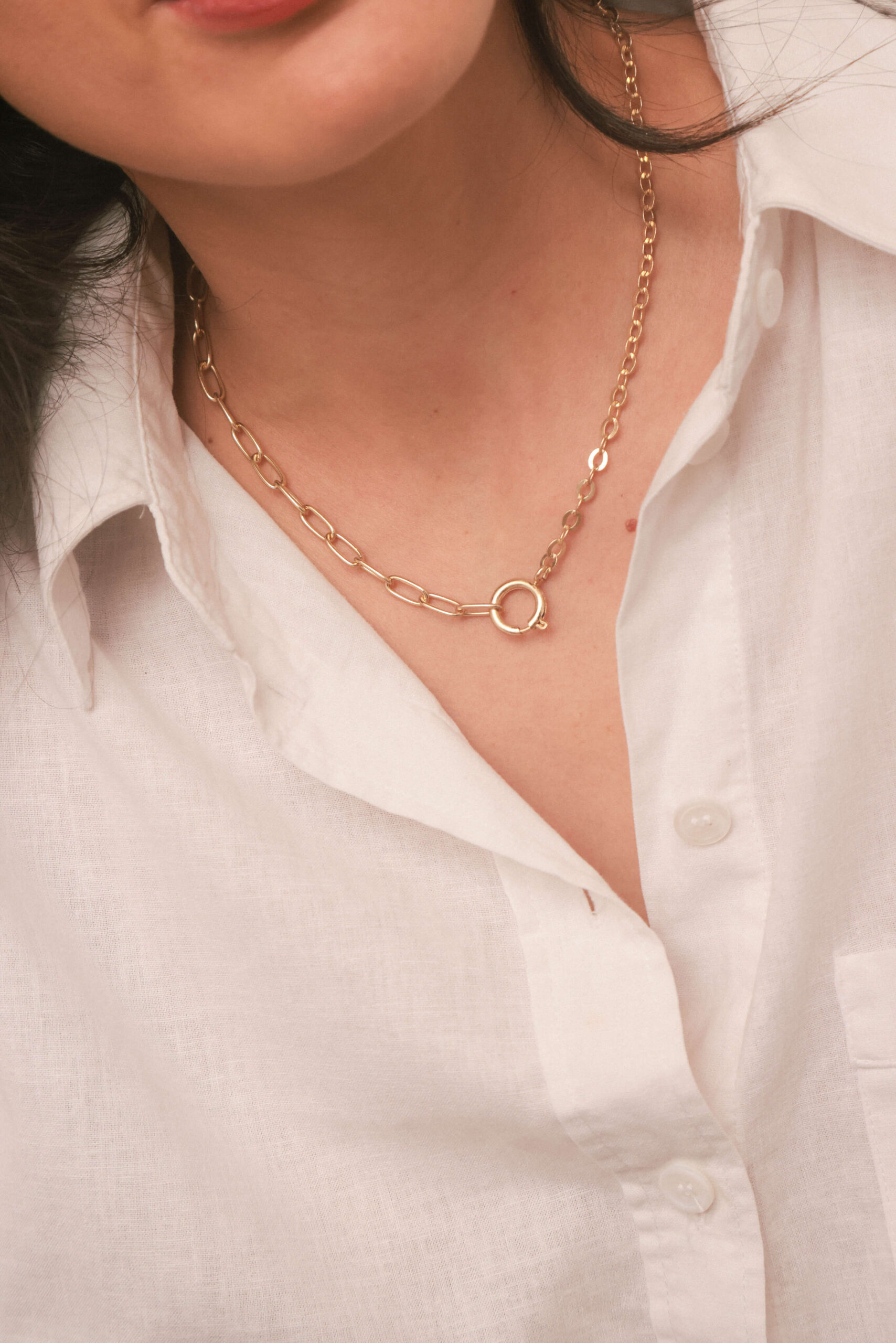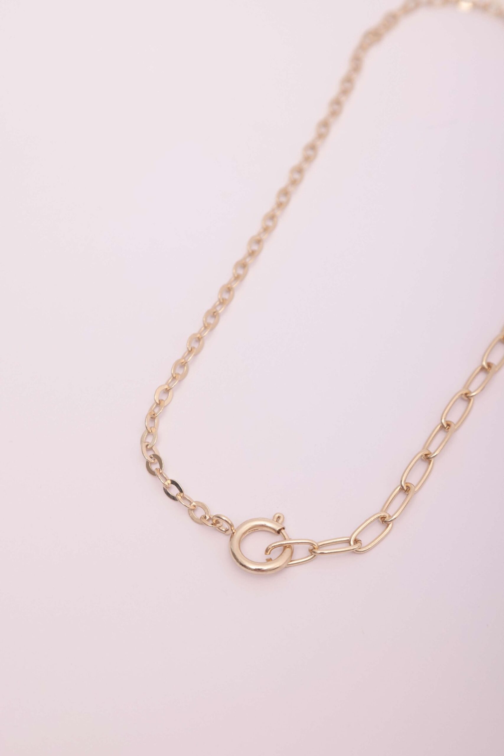 Cadena básica con dos grosores. Podes usar el gancho adelante o atrás y tener dos versiones de un solo collar.