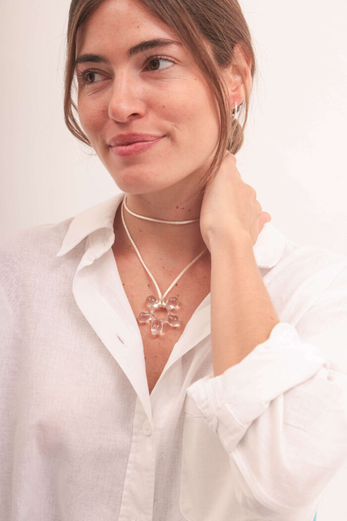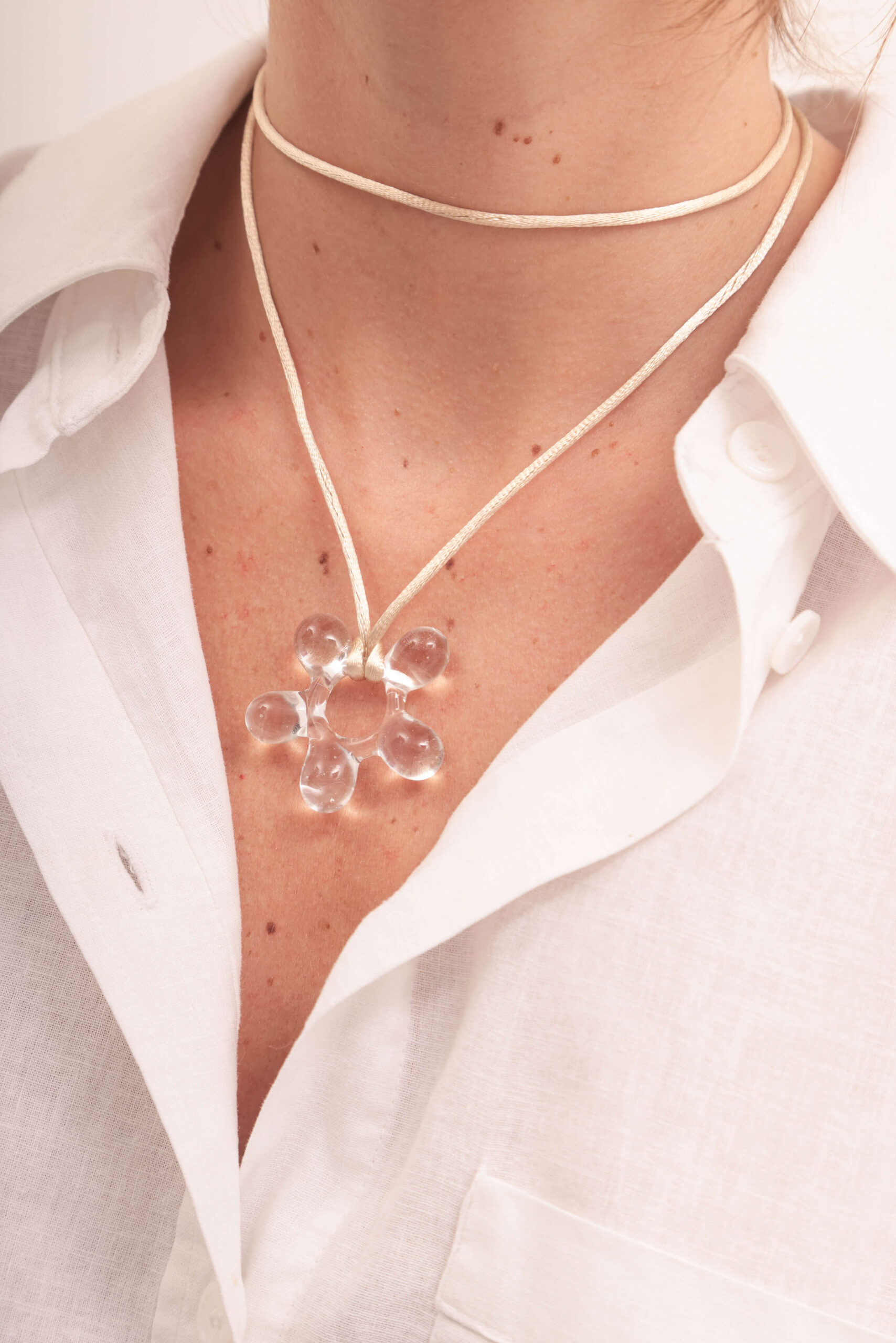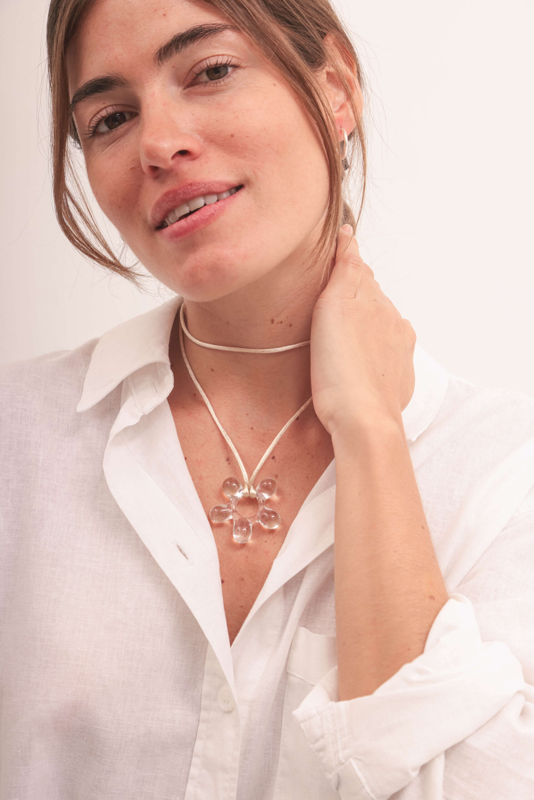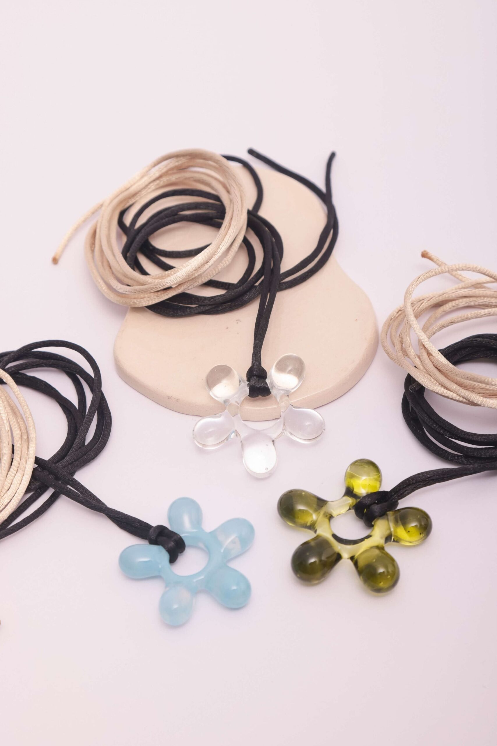 Materiales: Cordón de hilo de seda 140 cm. Dije de vidrio murano.