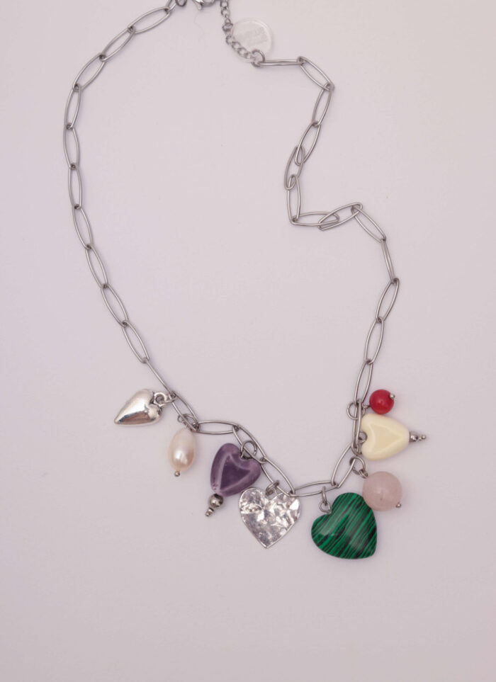 Cristal de cuarzo rosa, coral, perla de rio, dijes de corazon de malaquita, metal y vidrio.