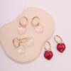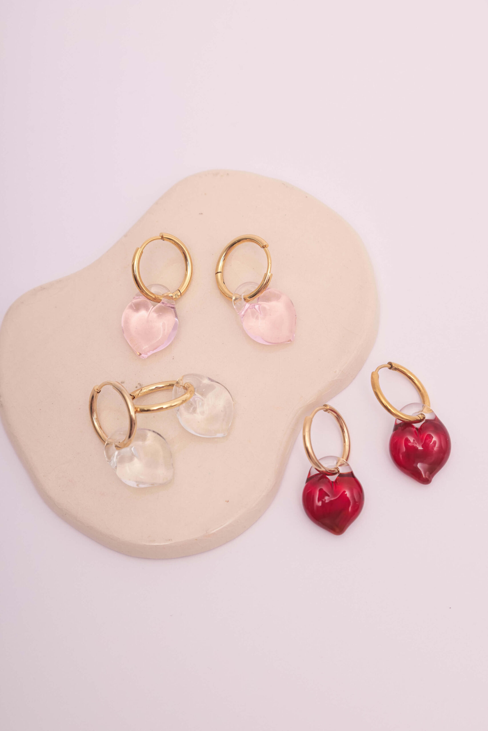 Aros. Par de argollas de acero dorado y donas de vidrio con forma corazón.