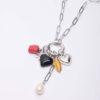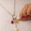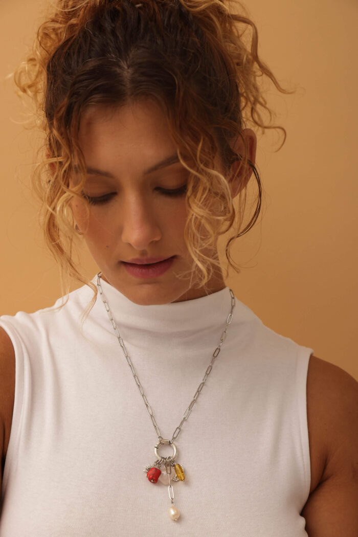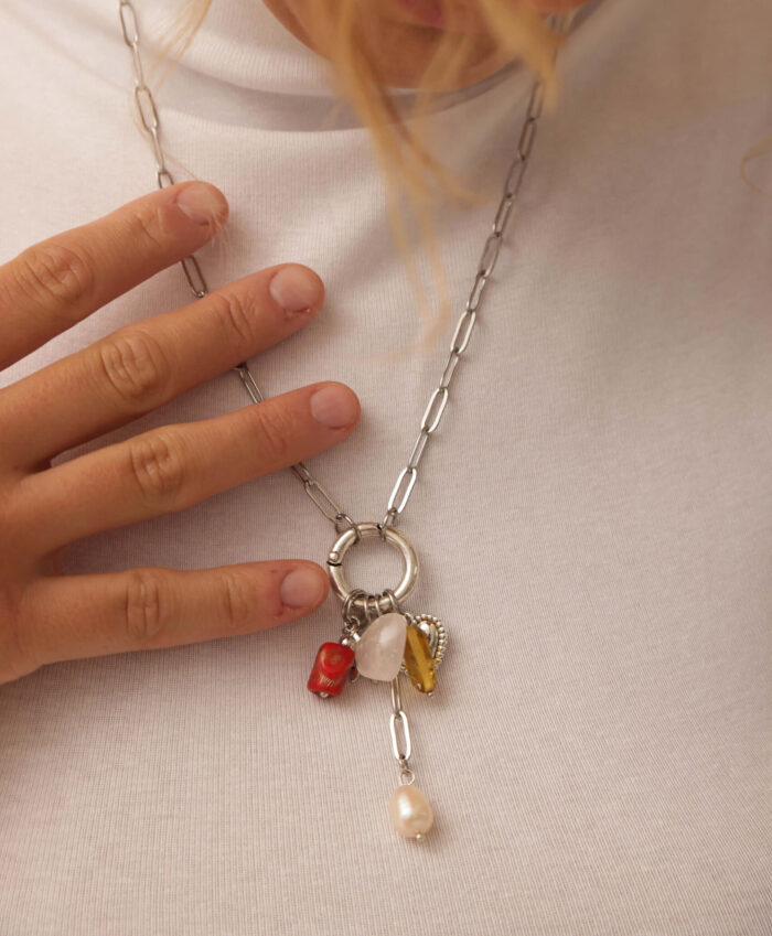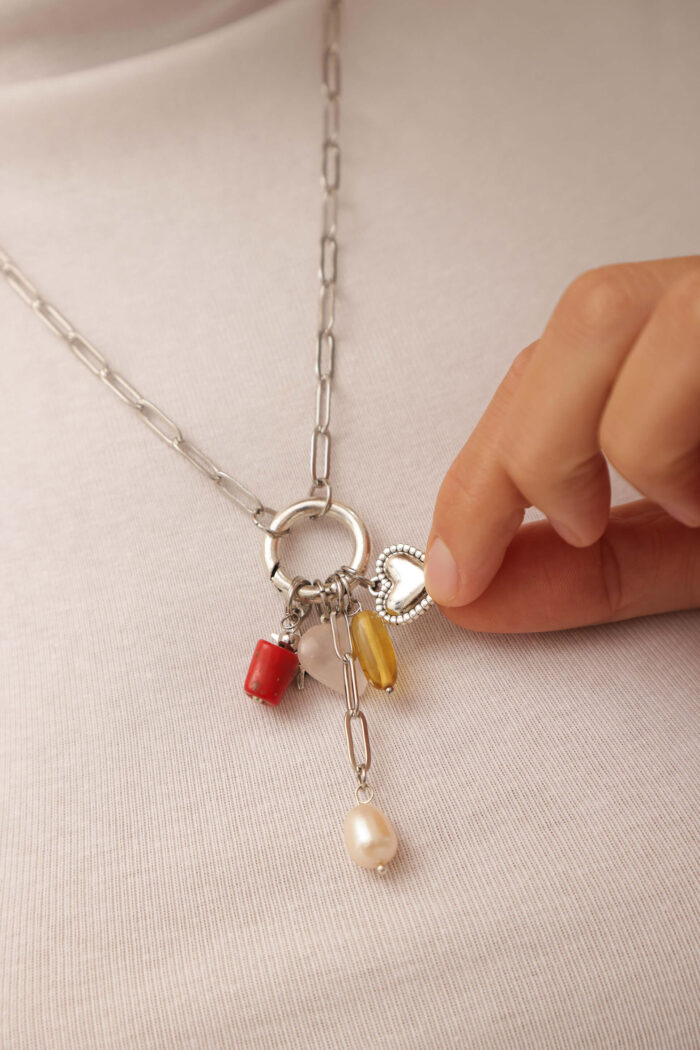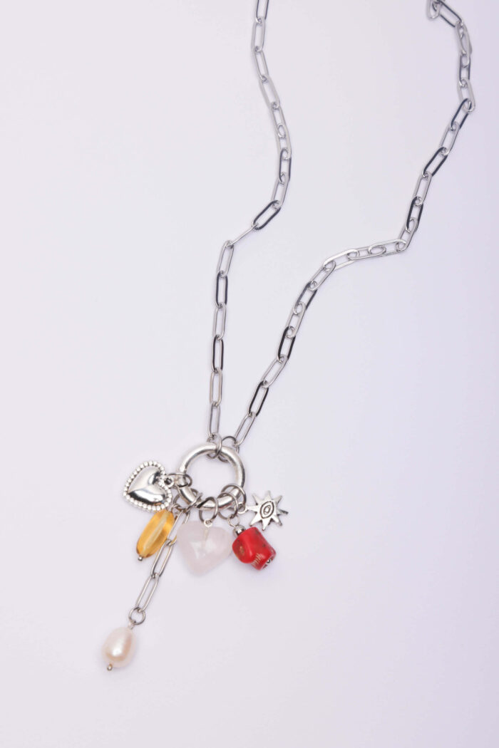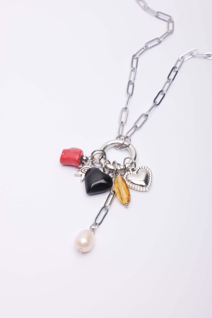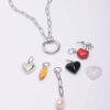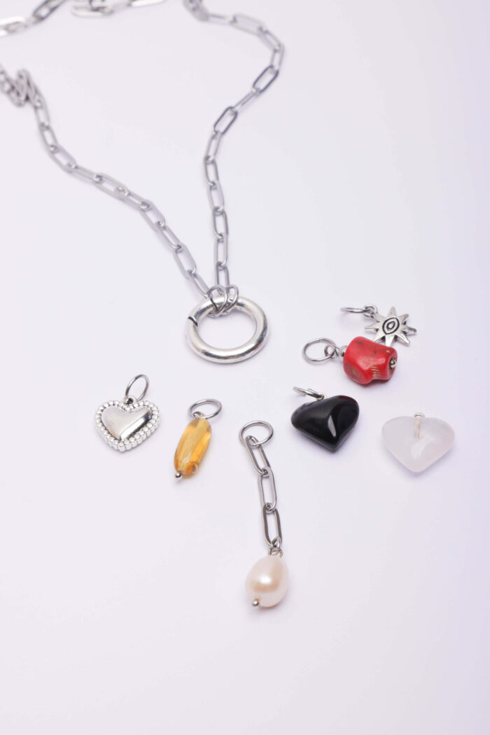 Materiales: Cadena de acero quirúrgico, dijes intercambiables con: perla de río, coral, ámbar, corazon de obsidiana o cuarzo rosa.