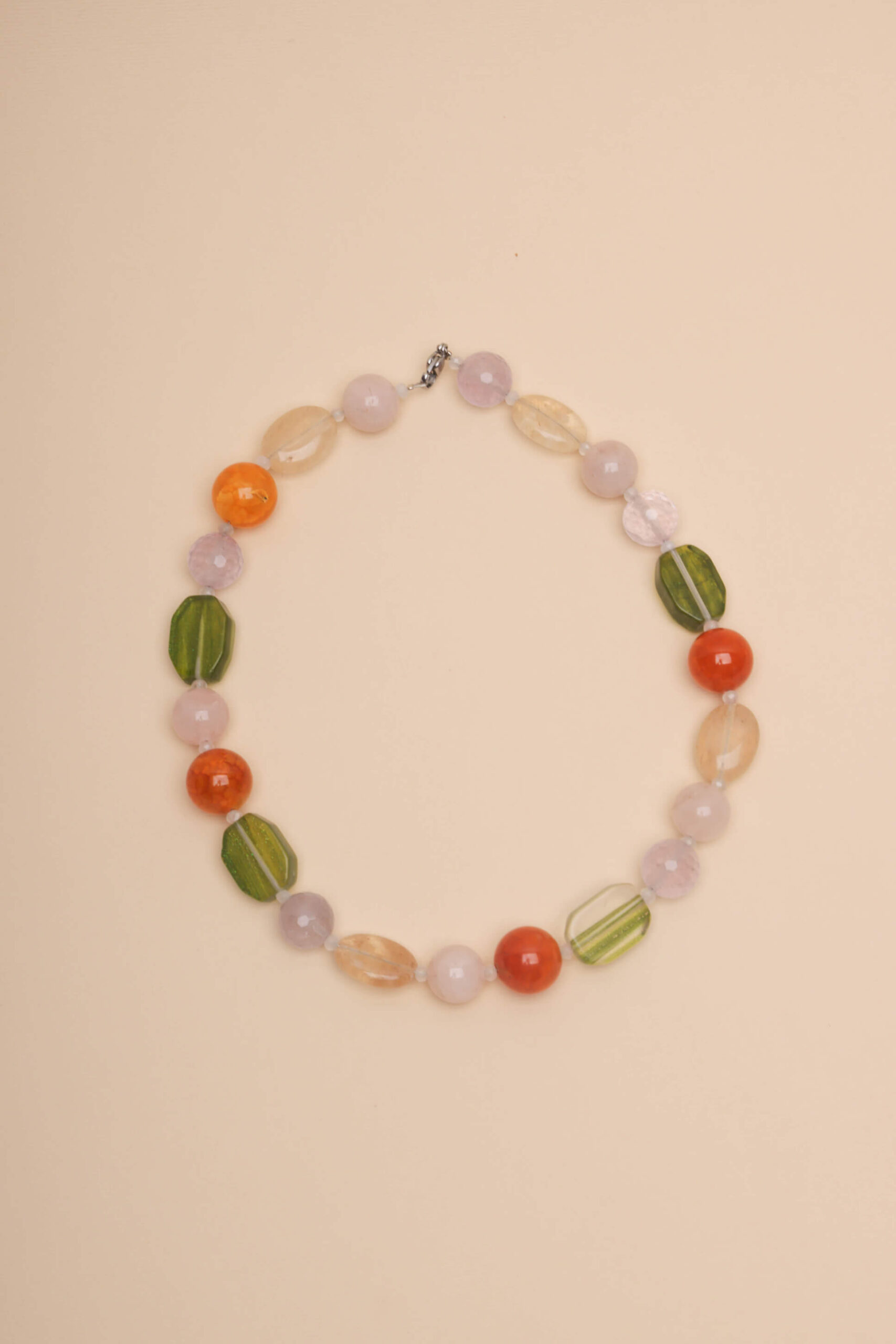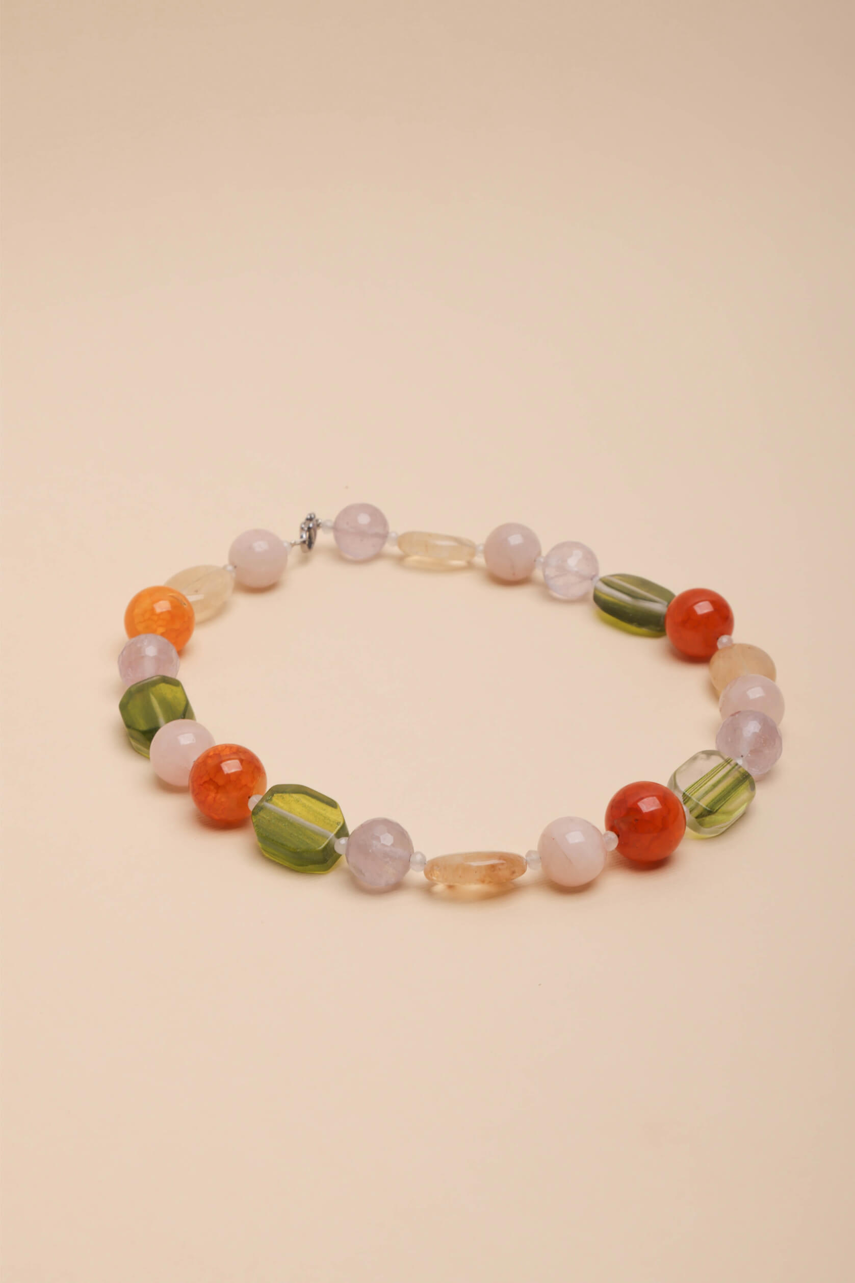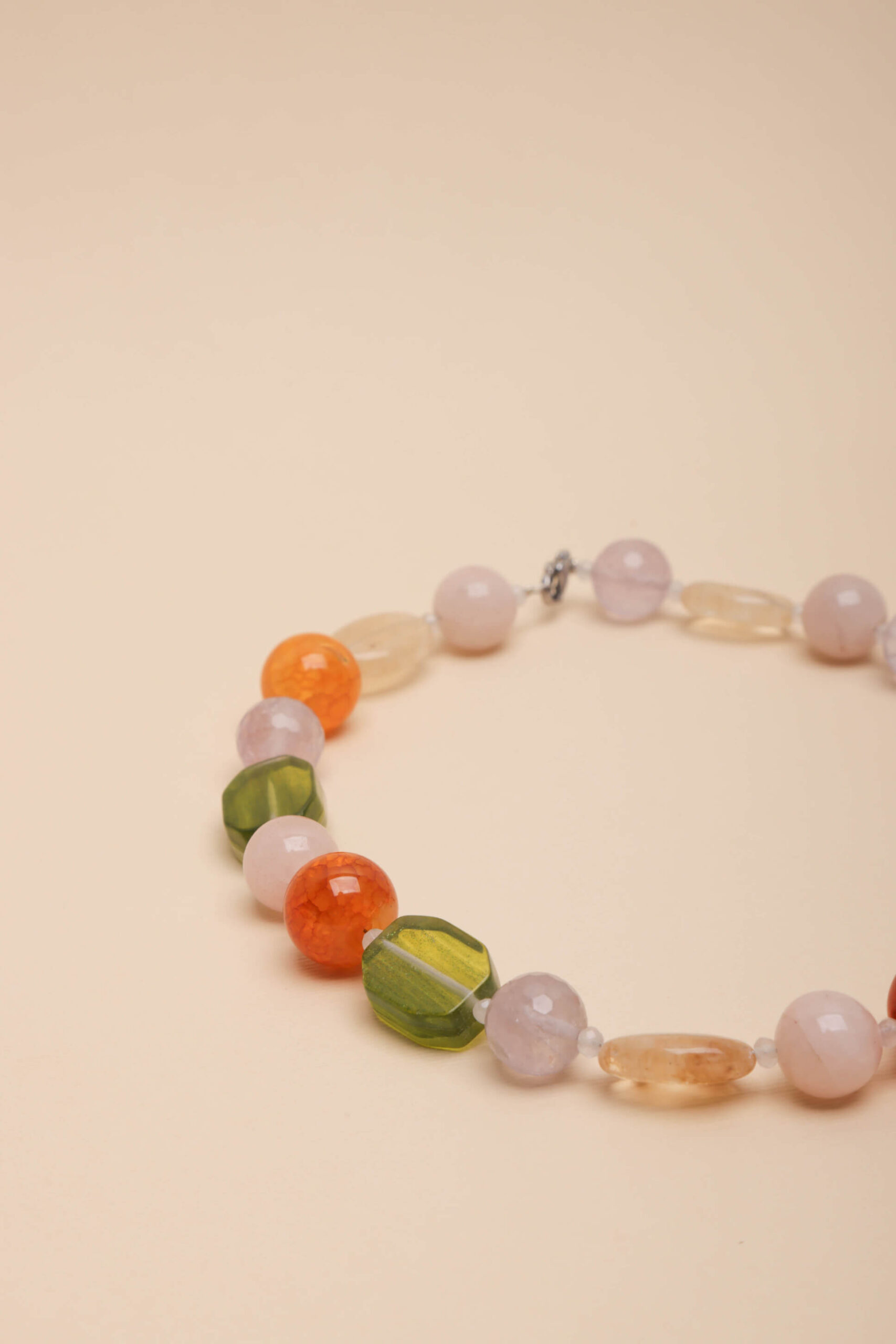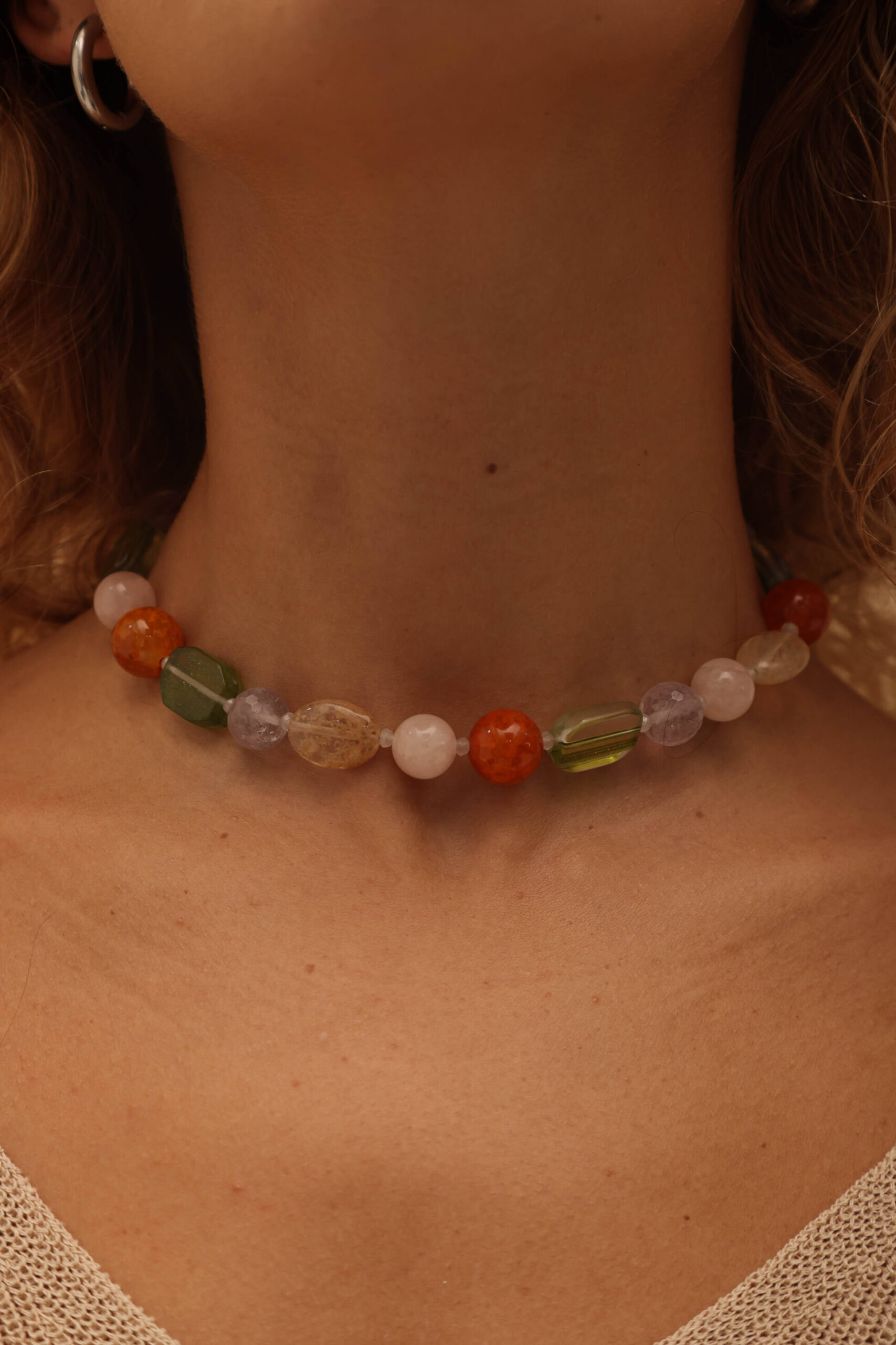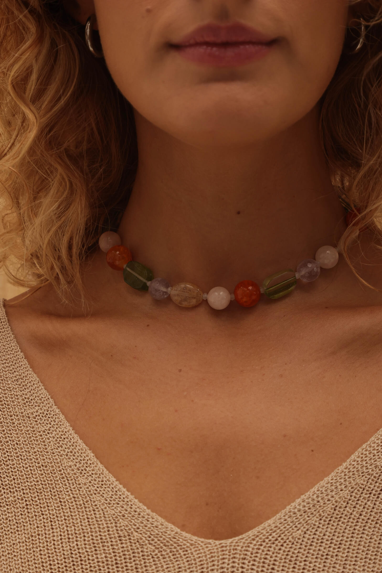 Materiales: Piedras minerales ágatas, cuarzo rosa y vidrio.