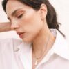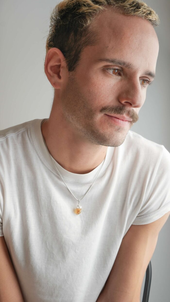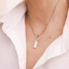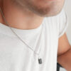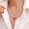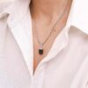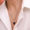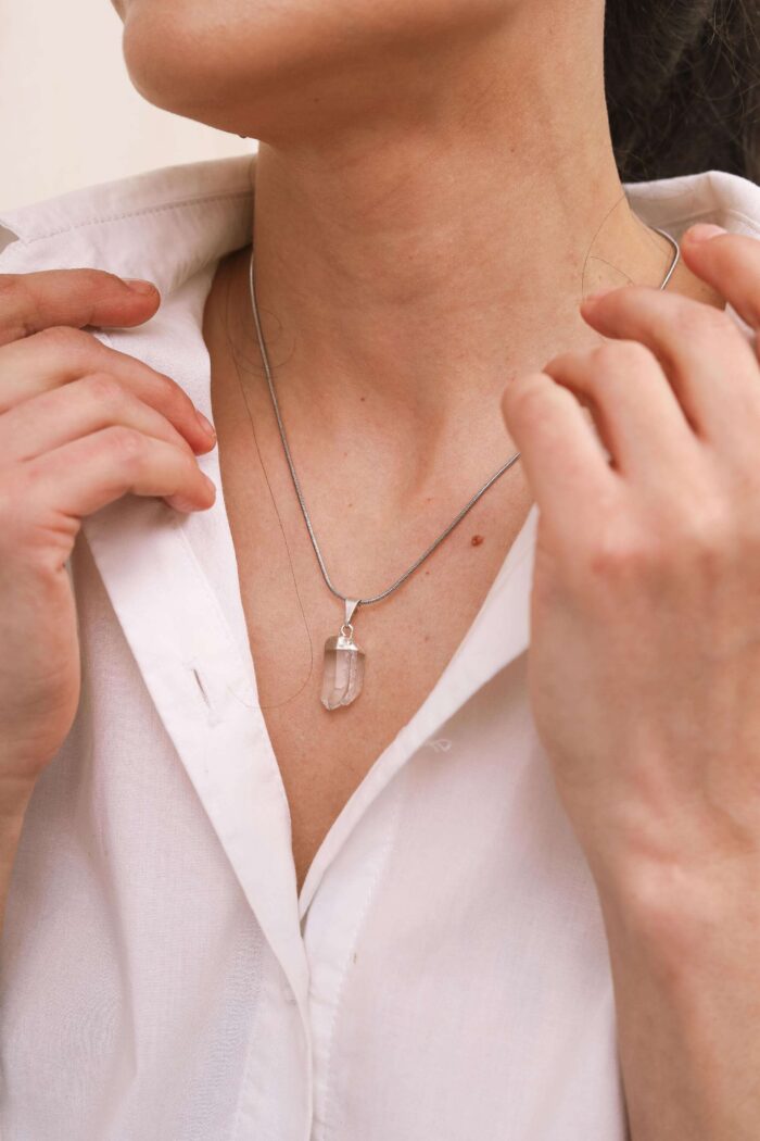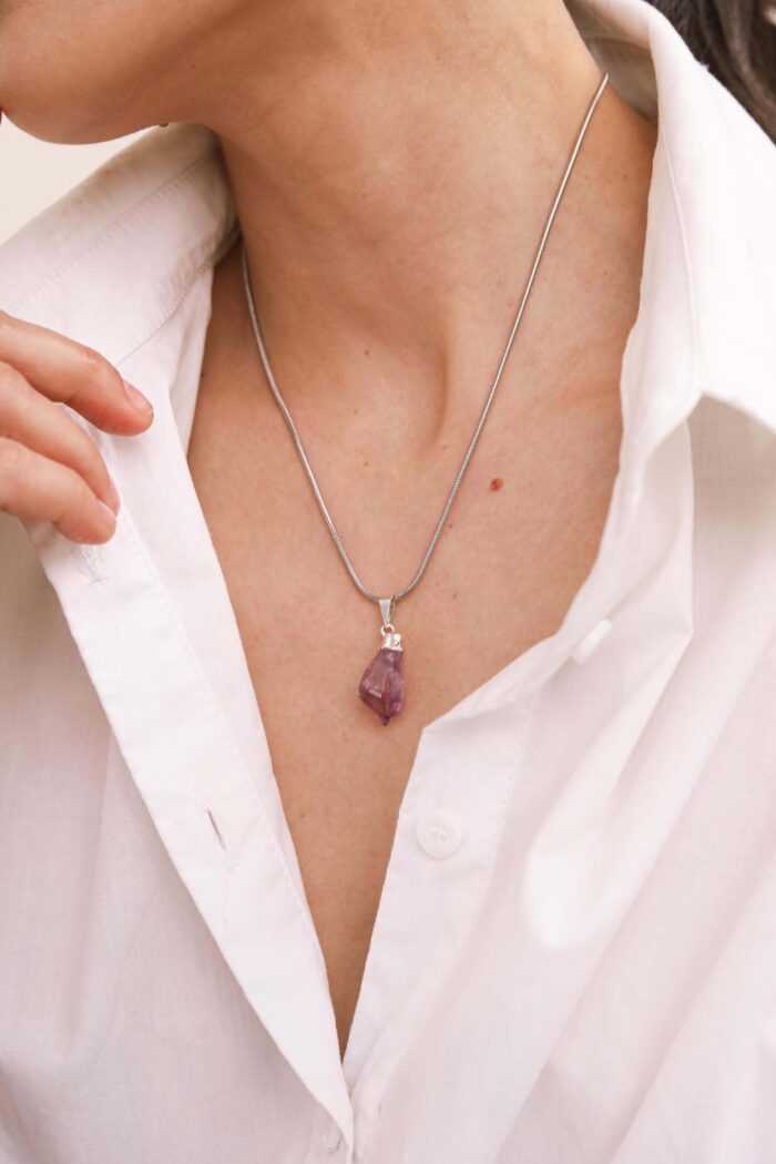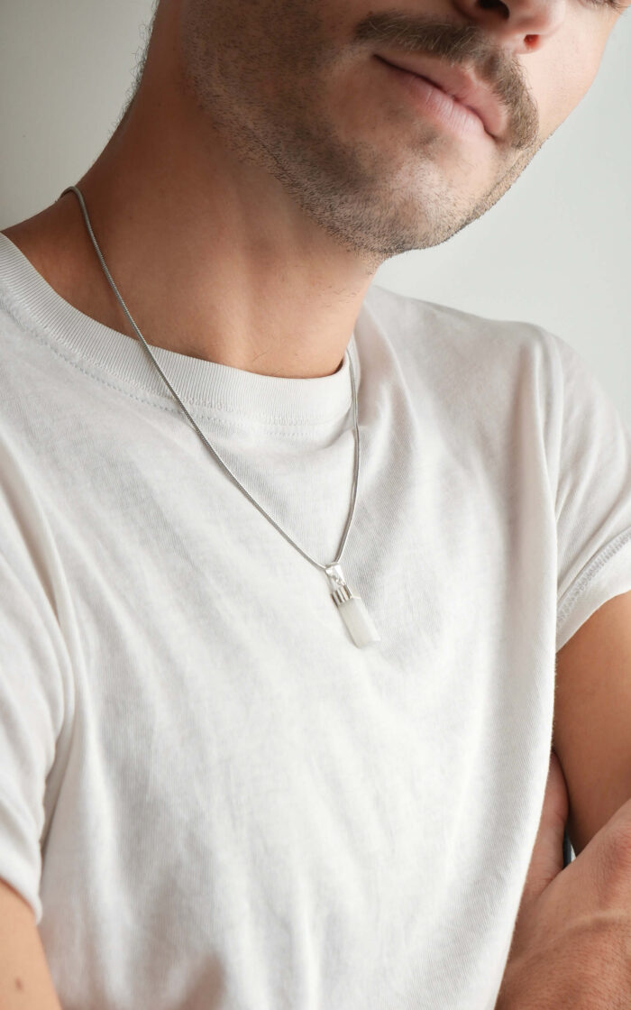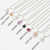Materiales: Cadenas de acero quirúrgico.Piedras minerales naturales con baño de plata. Cadena de alargue, argollas y cierre de acero quirúrgico. Chapita de la marca de acrílico.