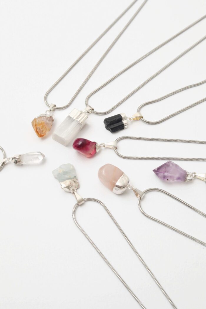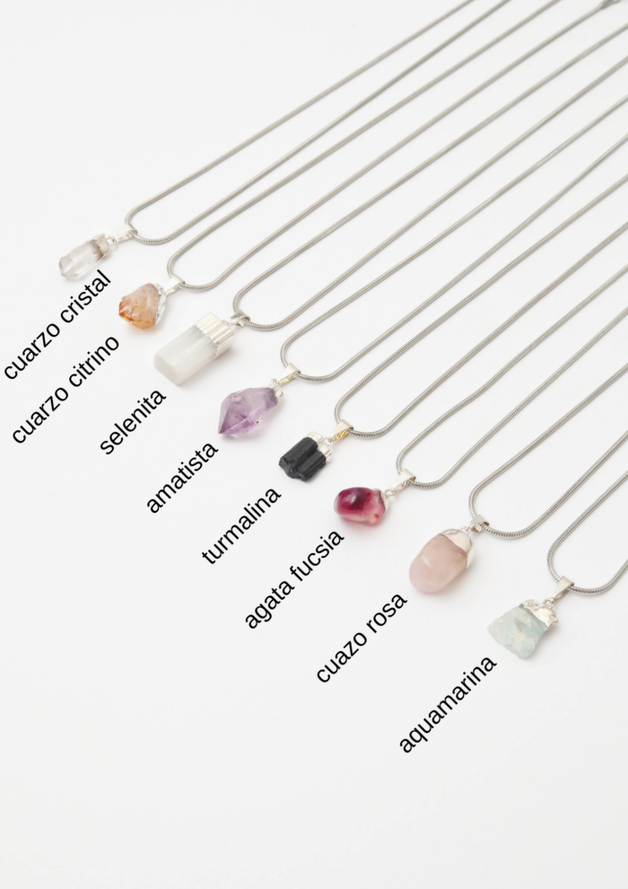 Turmalina negra, Amatista violeta, Cuarzo cristal, Cuarzo rosa, Selenita blanca, Cuarzo citrino amarillito, Ágata fucsia, Aquamarina verdecita