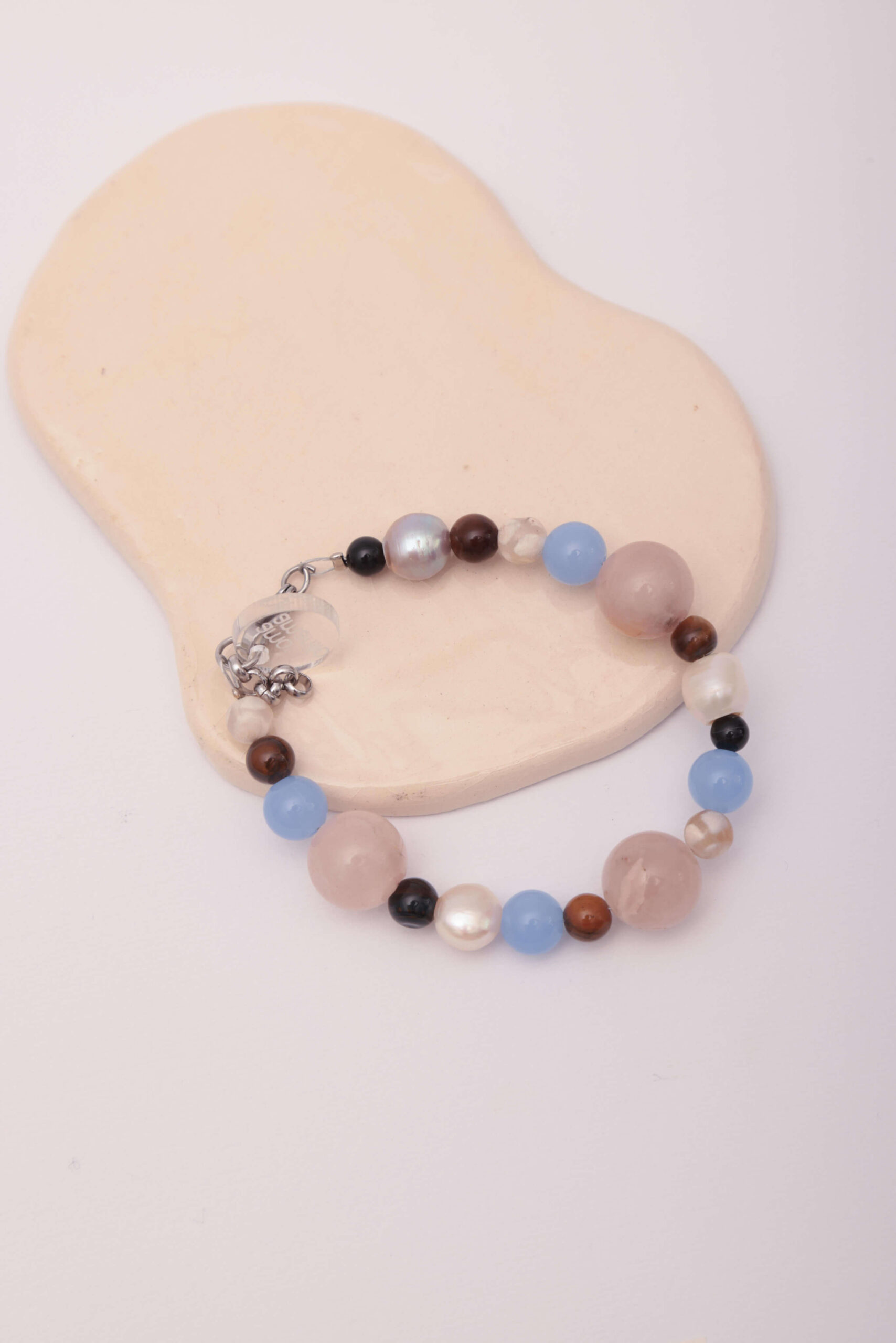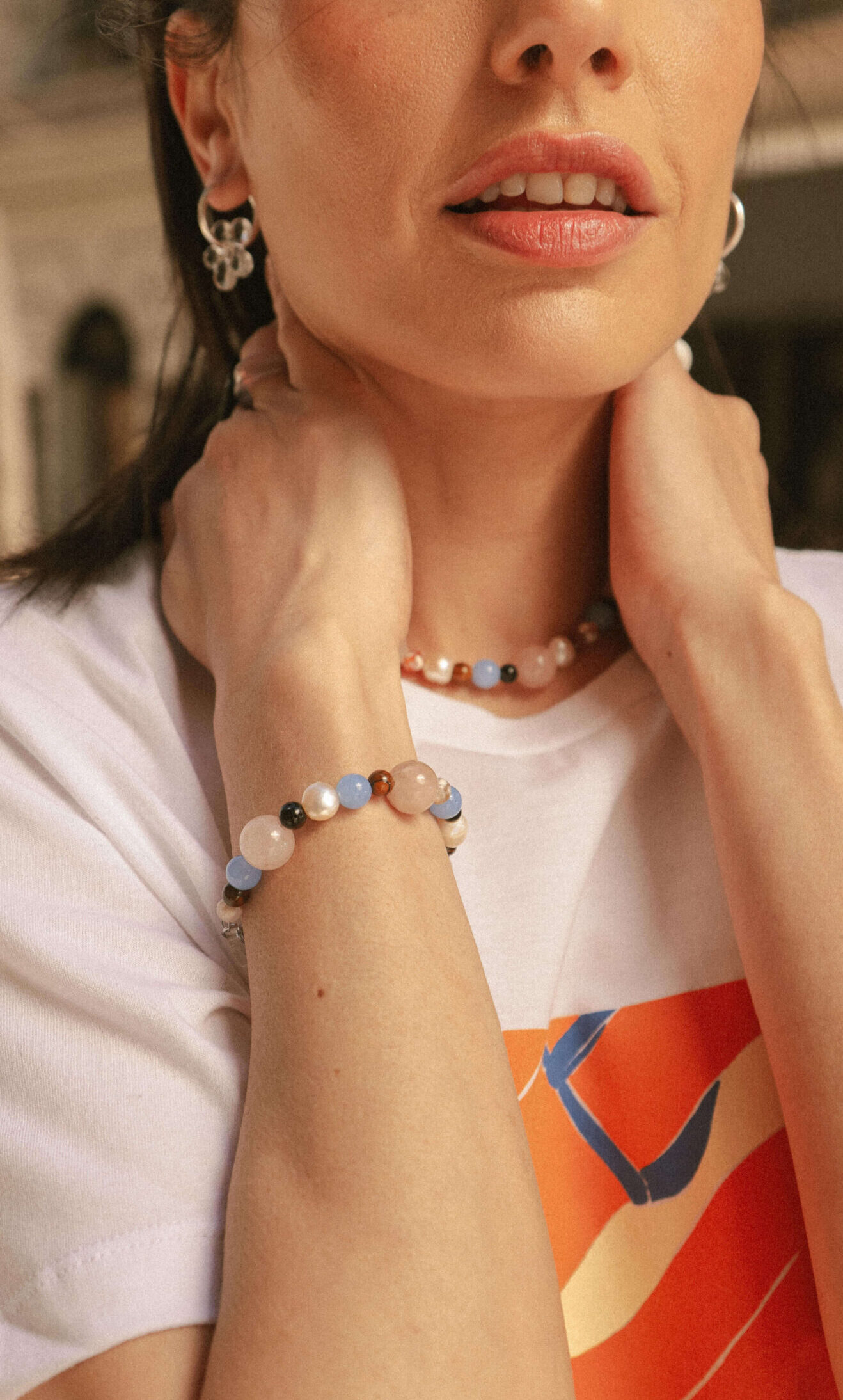 Materiales: Piedras minerales ojo de tigre, cuarzo rosa, ágata y perlas de río.