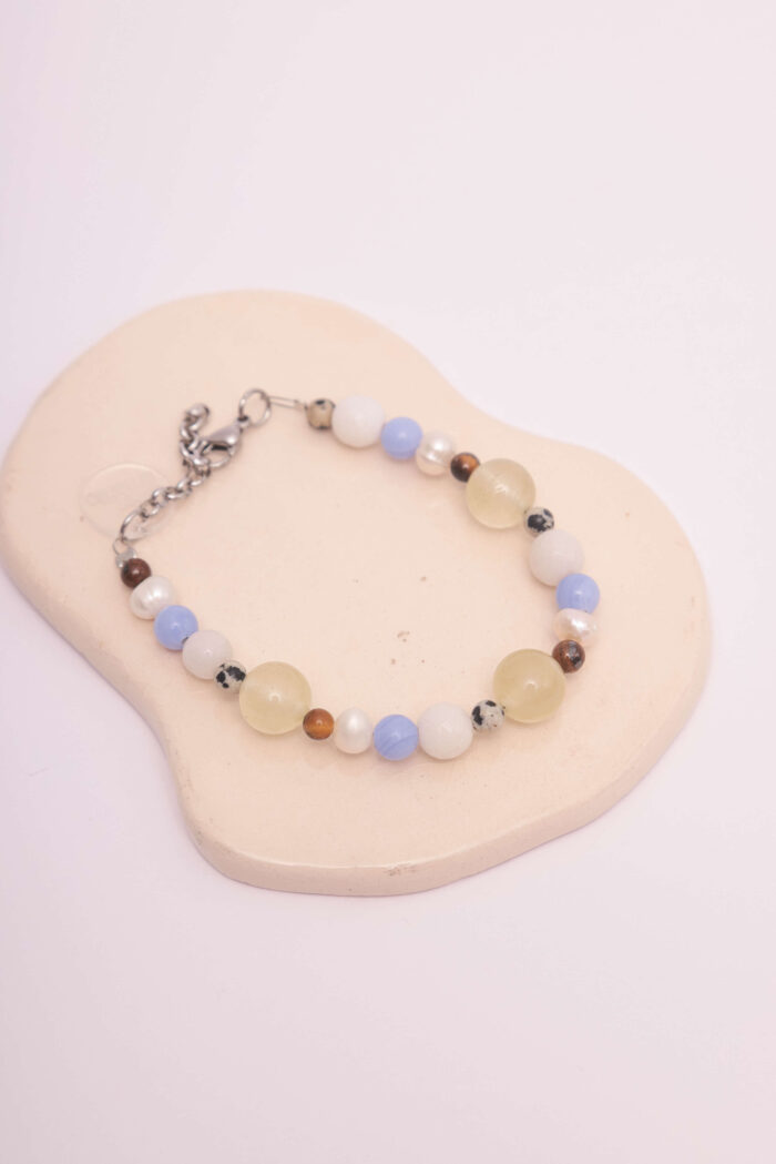Materiales: Piedras minerales ojo de tigre, jaspe dálmata, ágata y perlas de río.