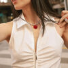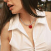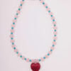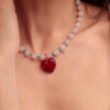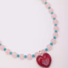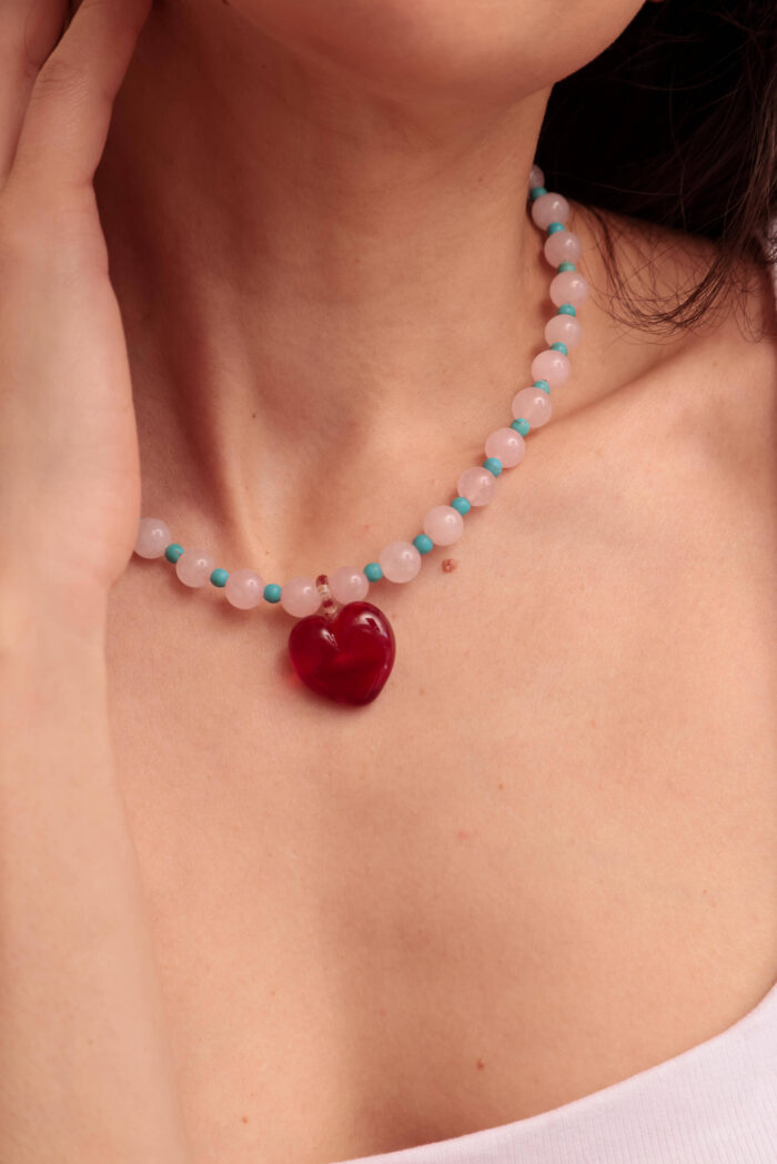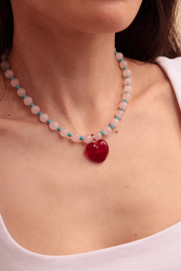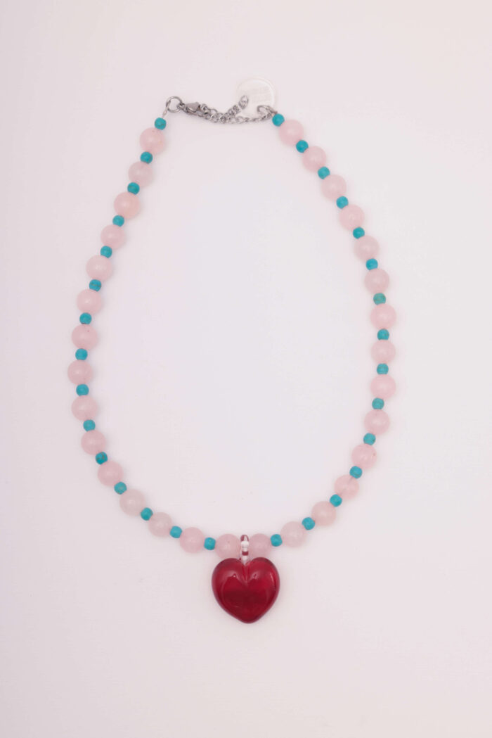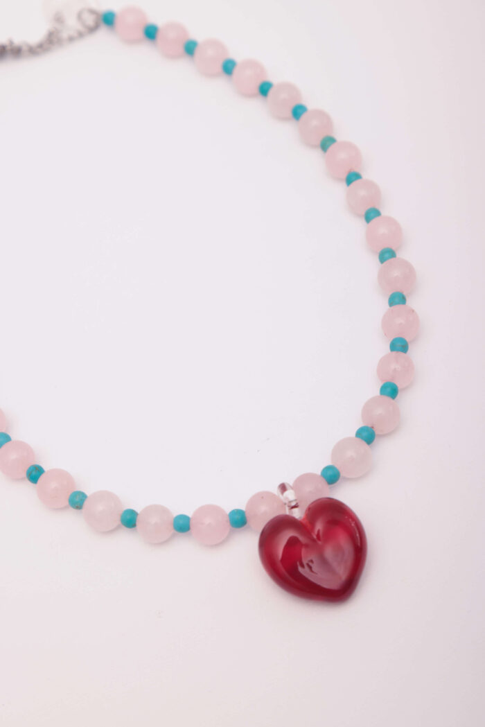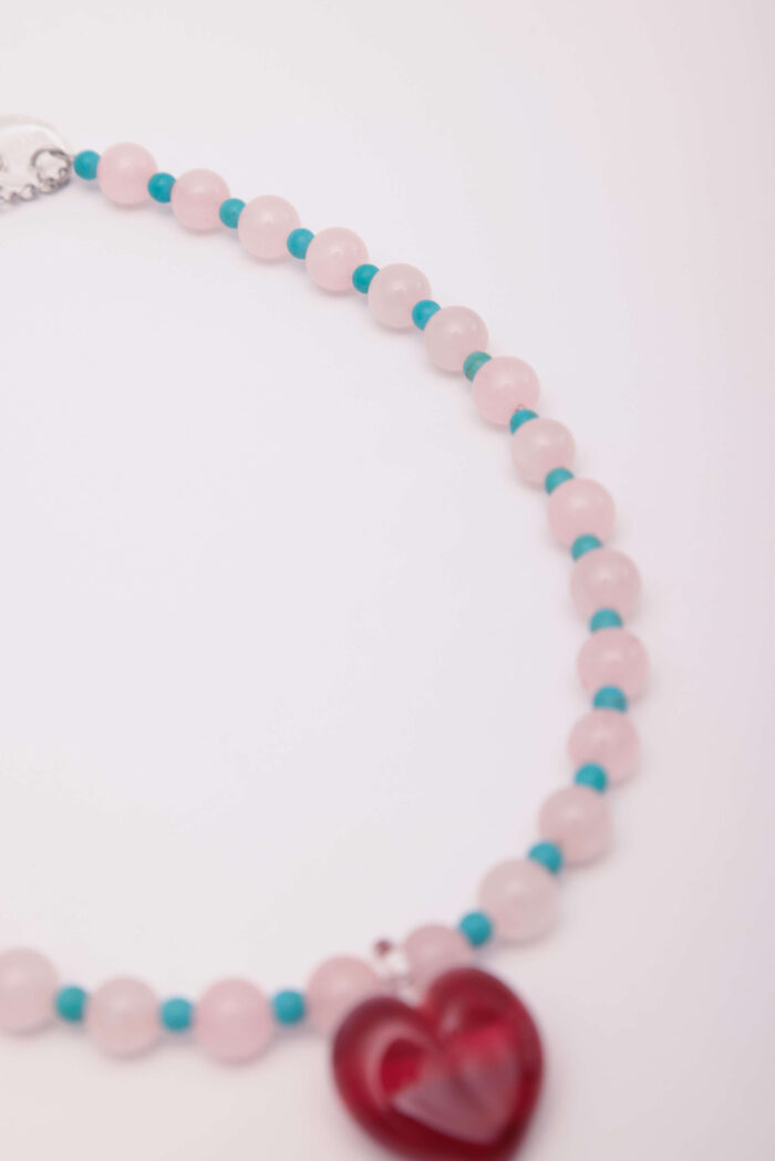 Materiales: cristales de cuarzo rosa, turquesa y dije corazón de vidrio murano.