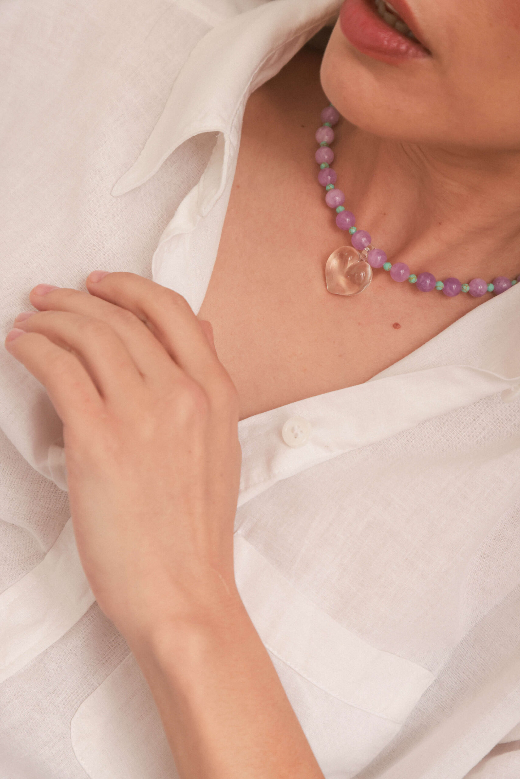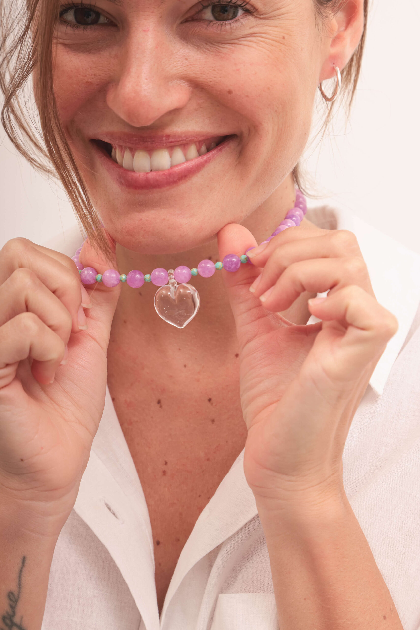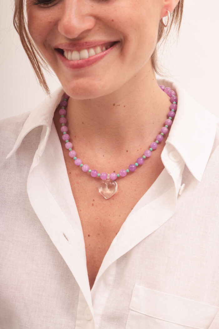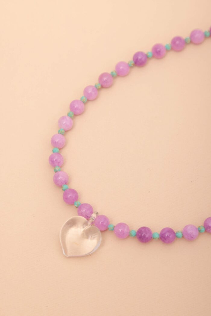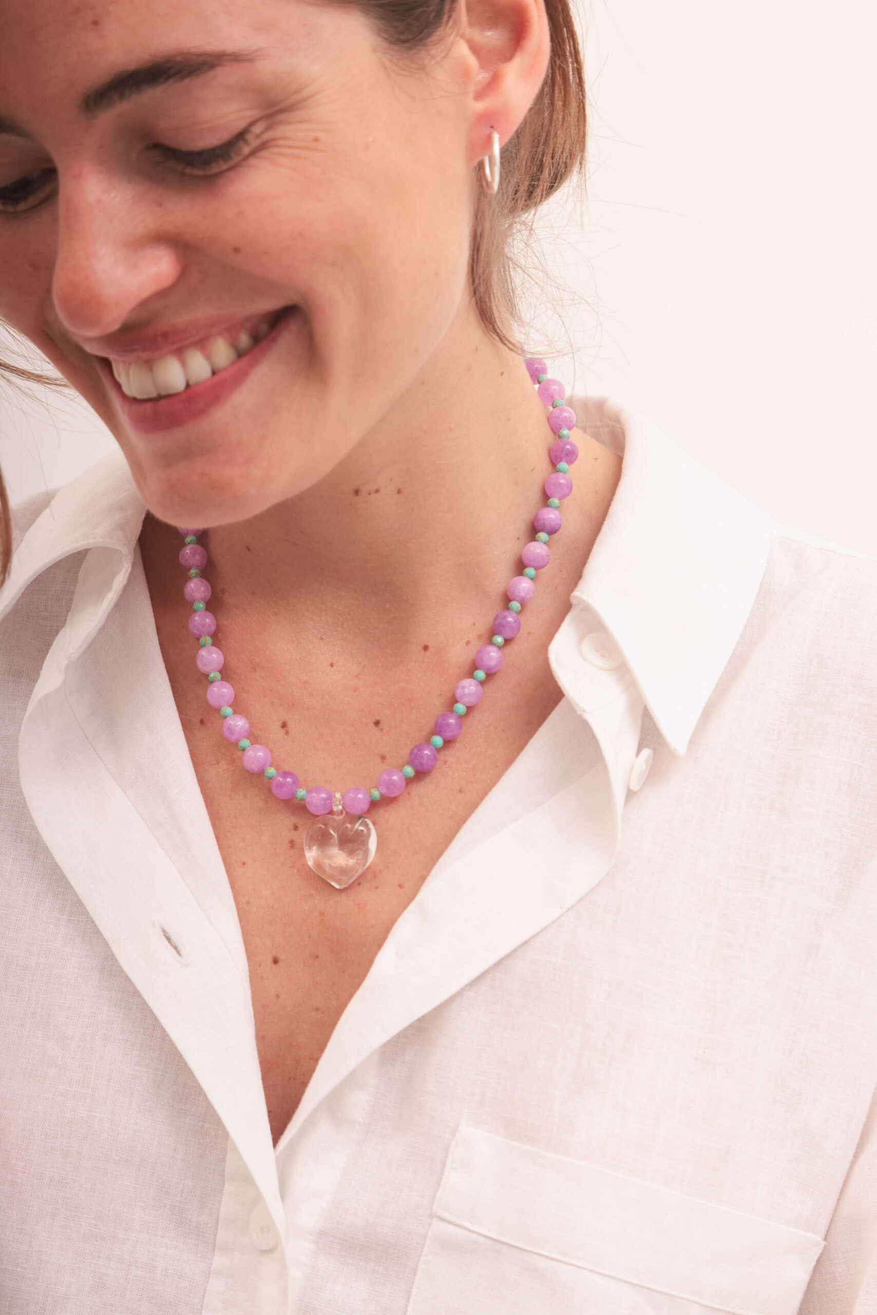 Materiales: cristales de ágata, turquesa y dije corazón de vidrio murano.